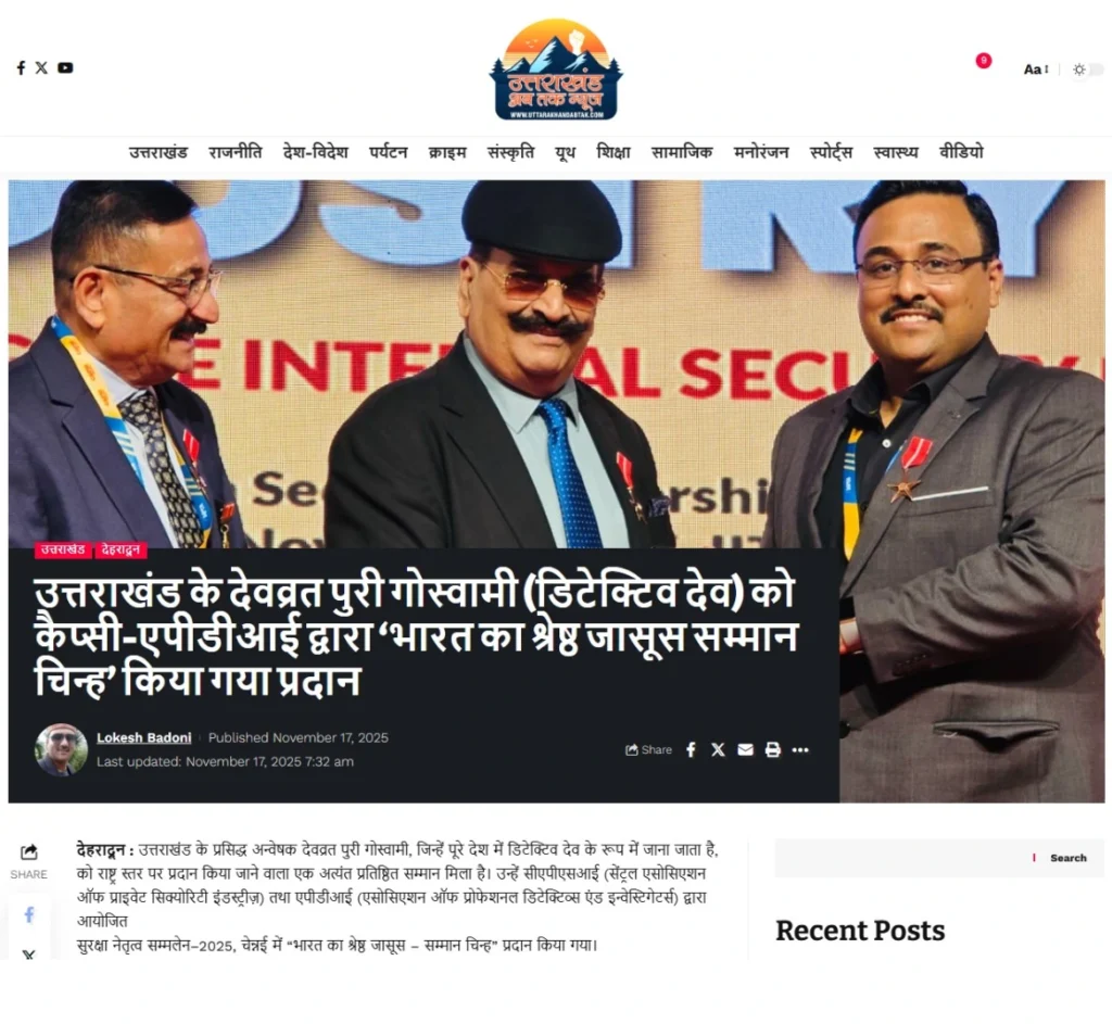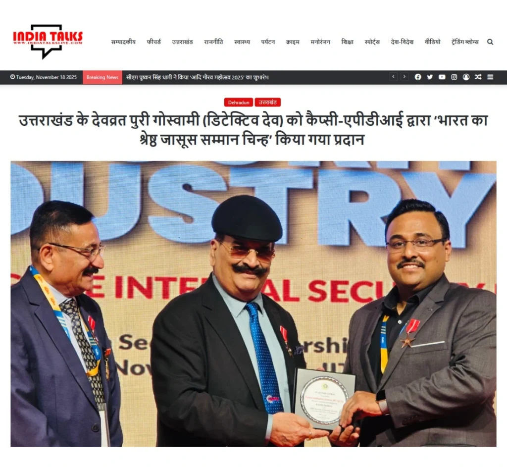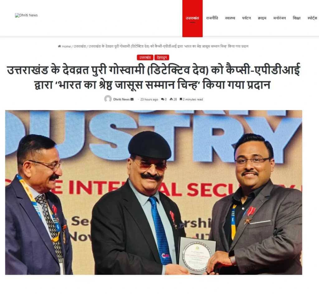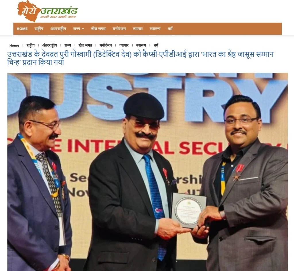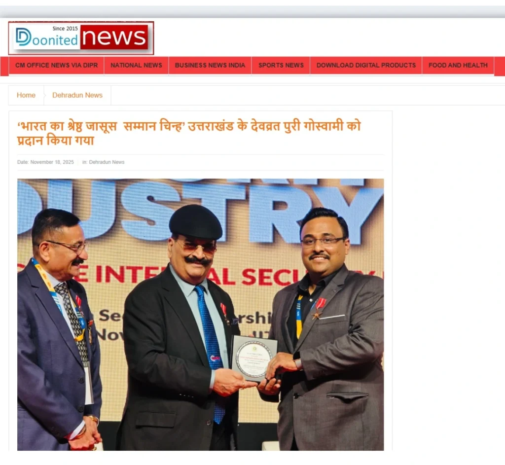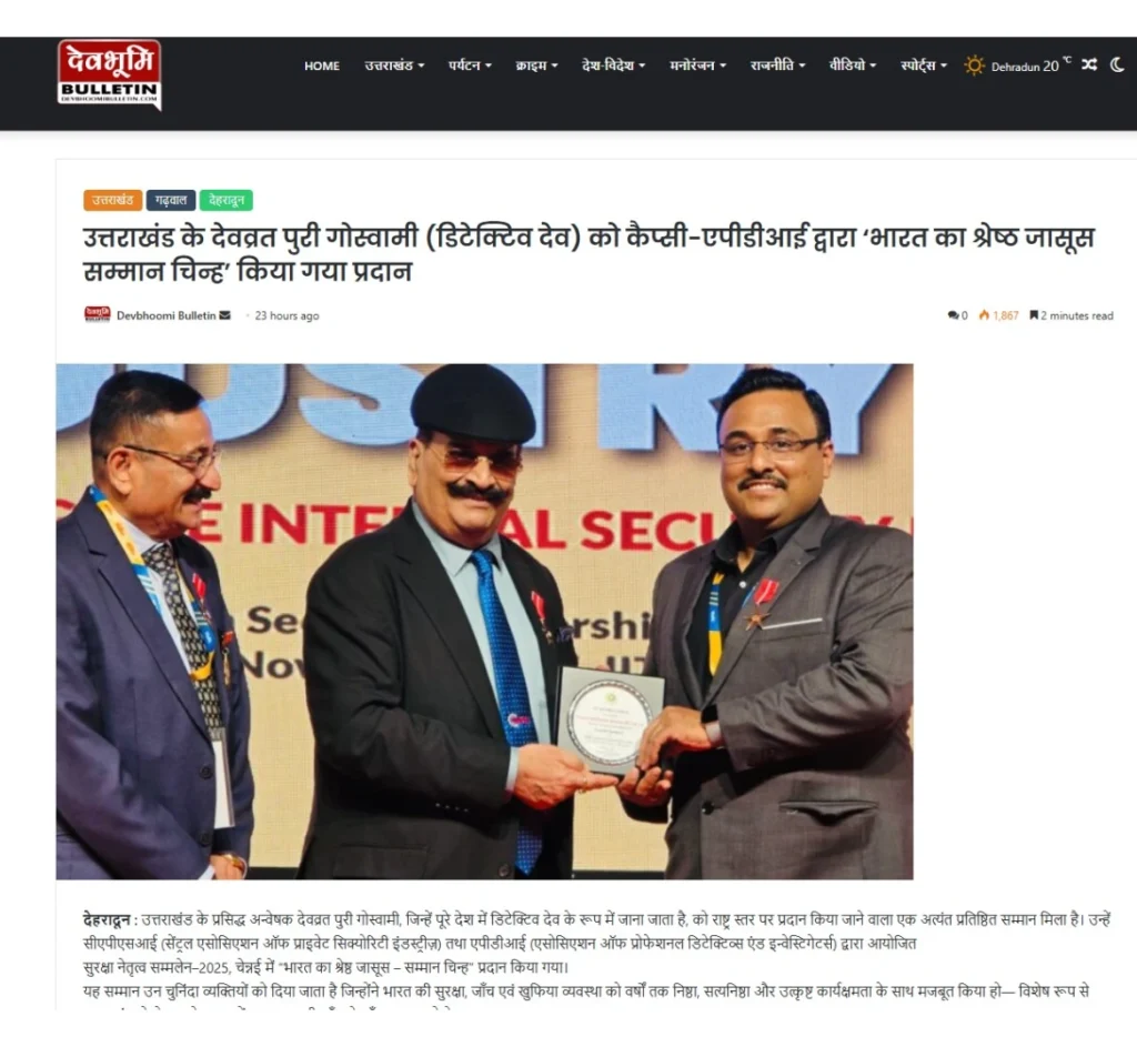 देवव्रत पुरी गोस्वामी (डिटेक्टिव देव) को देवभूमि राष्ट्रीय रत्न पुरस्कार 2025 से नवाज़ा गया। उन्हें यह राष्ट्रीय गौरव “जासूसी खुफिया उत्कृष्टता” (Detective Intelligence Excellence) श्रेणी में प्रदान किया गया, उनके अदृश्य लेकिन निर्णायक योगदान, राष्ट्रसेवा में अभूतपूर्व समर्पण और खुफिया अभियानों में अद्वितीय नेतृत्व के लिए कार्यक्रम के मुख्य अतिथि रहे सुबोध उनियाल, माननीय वन एवं उच्च शिक्षा मंत्री, उत्तराखंड सरकार द्वारा सम्मानित किया गया।