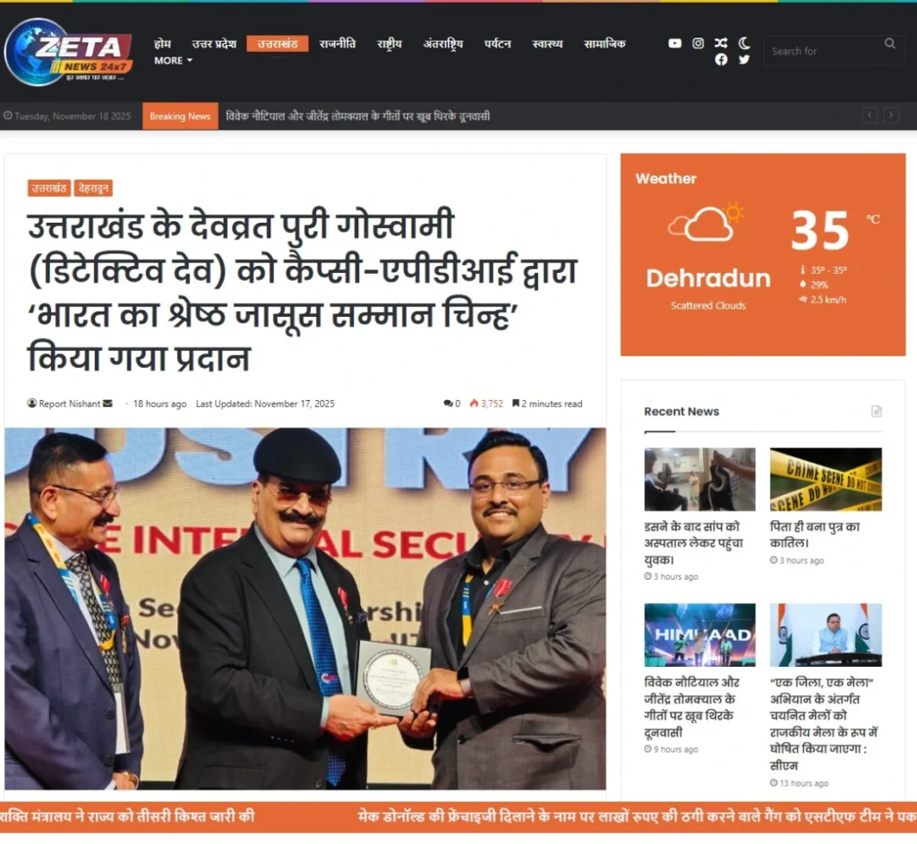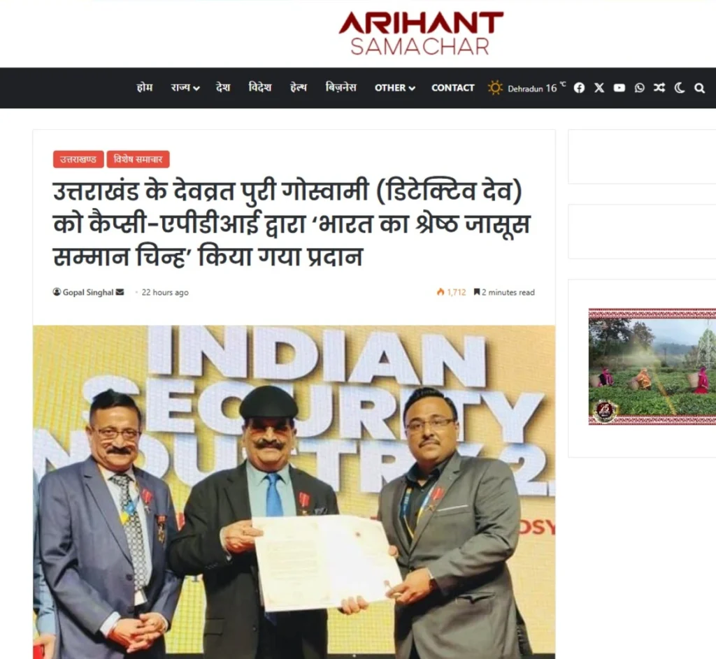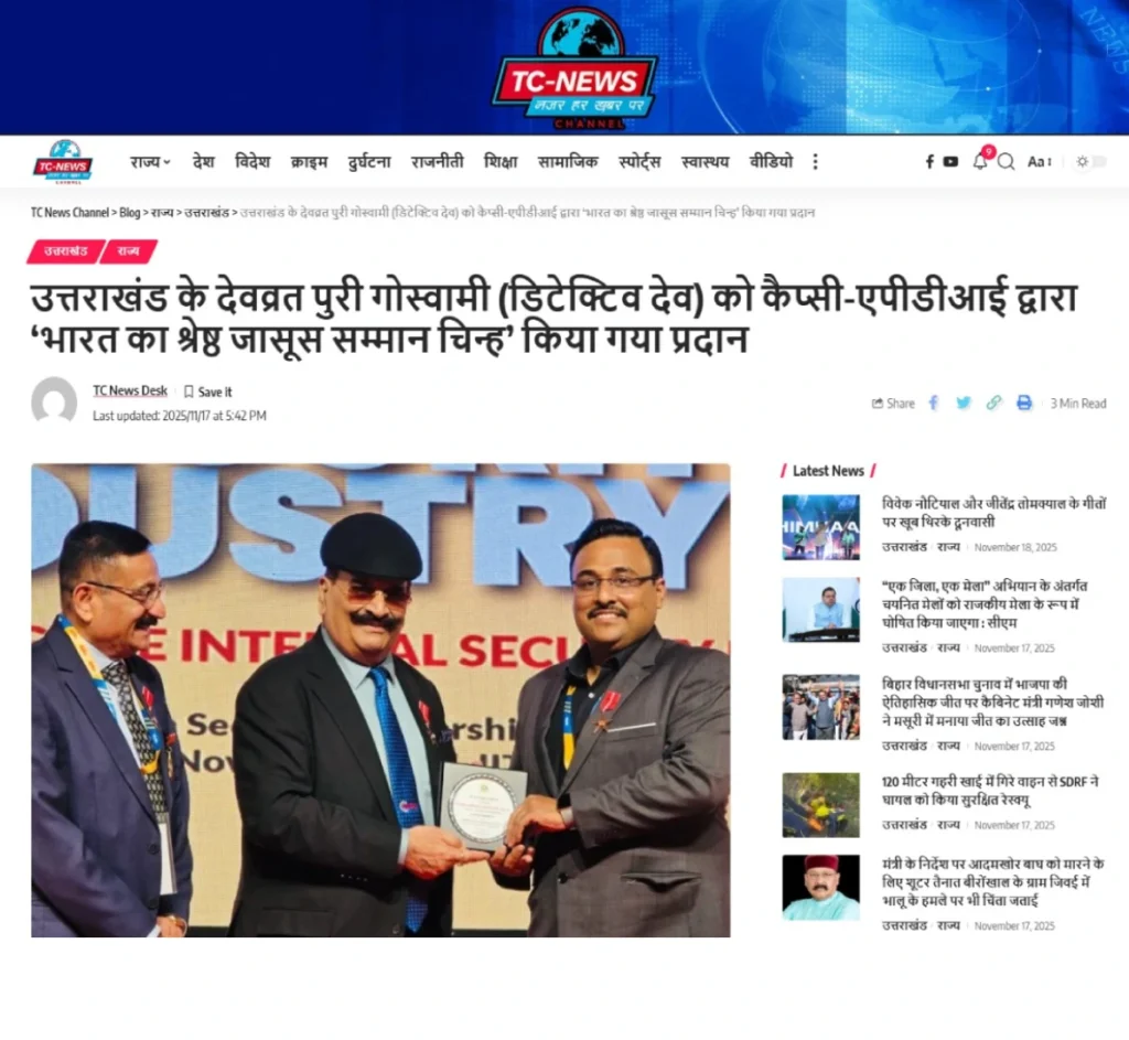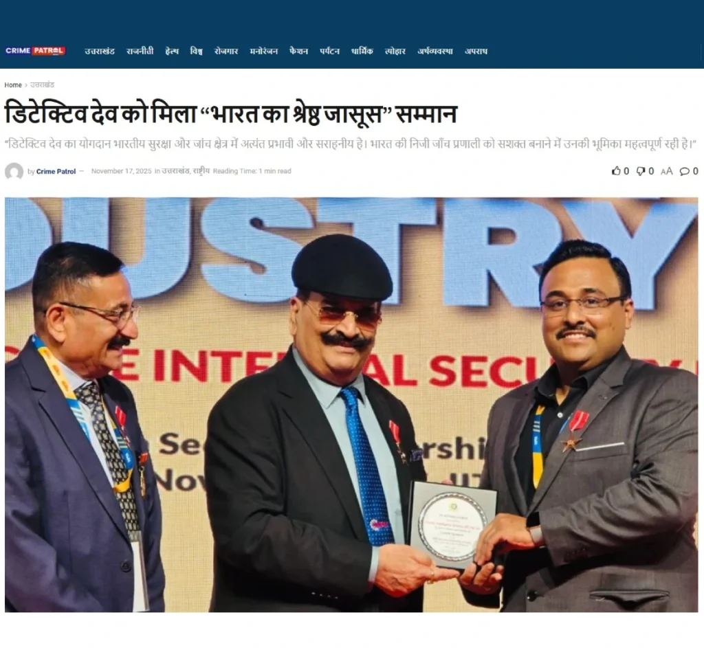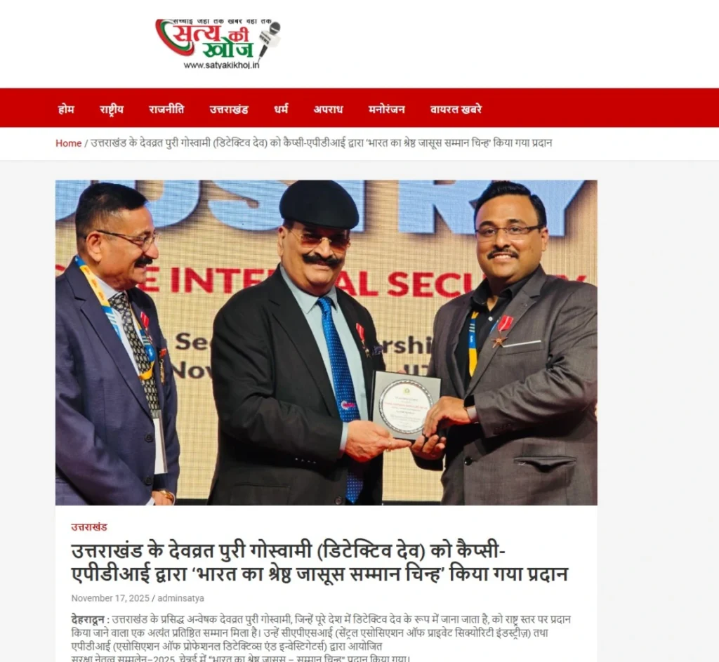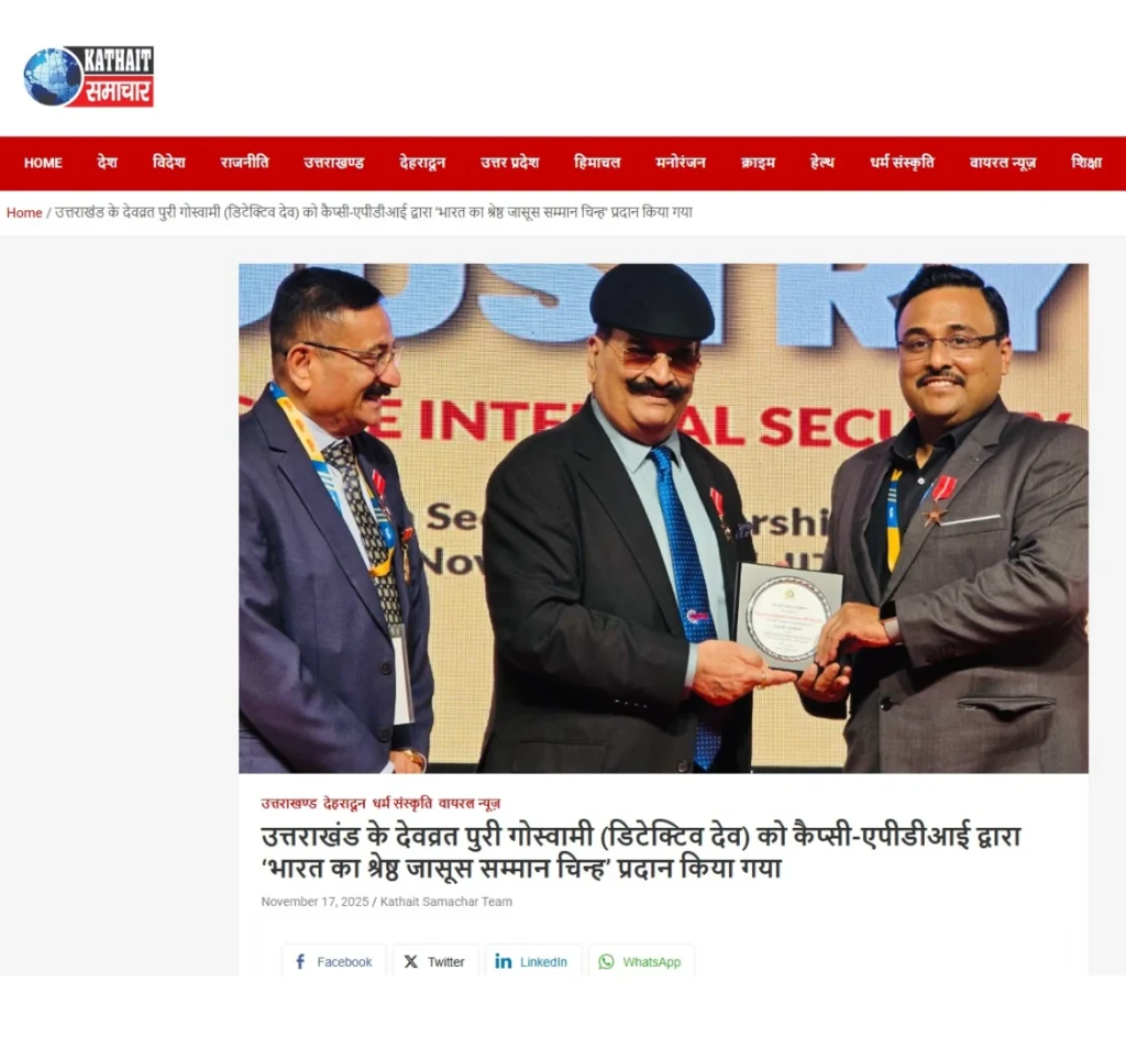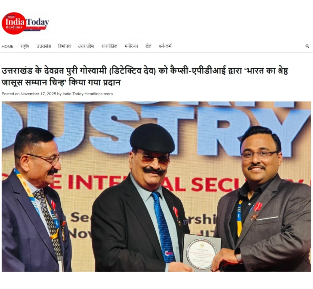 देवव्रत पुरी गोस्वामी (डिटेक्टिव देव) को देवभूमि राष्ट्रीय रत्न पुरस्कार 2025 से नवाज़ा गया। उन्हें यह राष्ट्रीय गौरव “जासूसी खुफिया उत्कृष्टता” (Detective Intelligence Excellence) श्रेणी में प्रदान किया गया, उनके अदृश्य लेकिन निर्णायक योगदान, राष्ट्रसेवा में अभूतपूर्व समर्पण और खुफिया अभियानों में अद्वितीय नेतृत्व के लिए कार्यक्रम के मुख्य अतिथि रहे सुबोध उनियाल, माननीय वन एवं उच्च शिक्षा मंत्री, उत्तराखंड सरकार द्वारा सम्मानित किया गया।