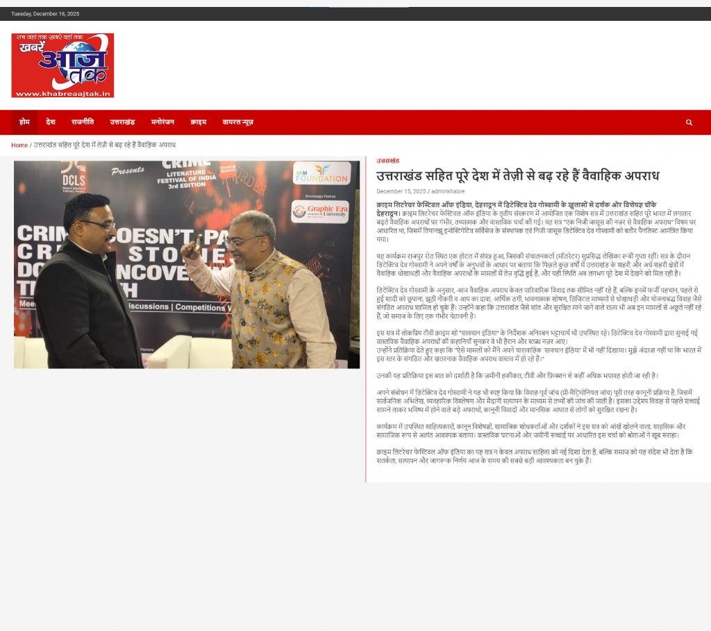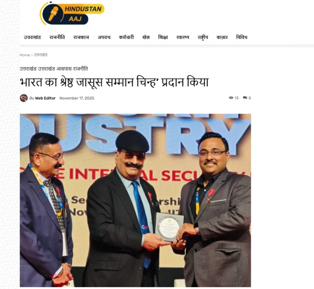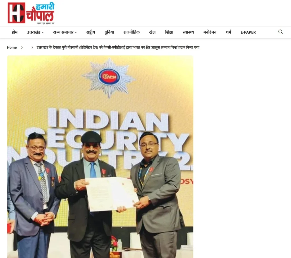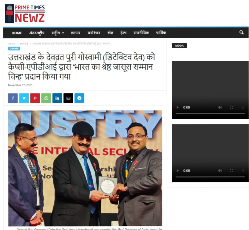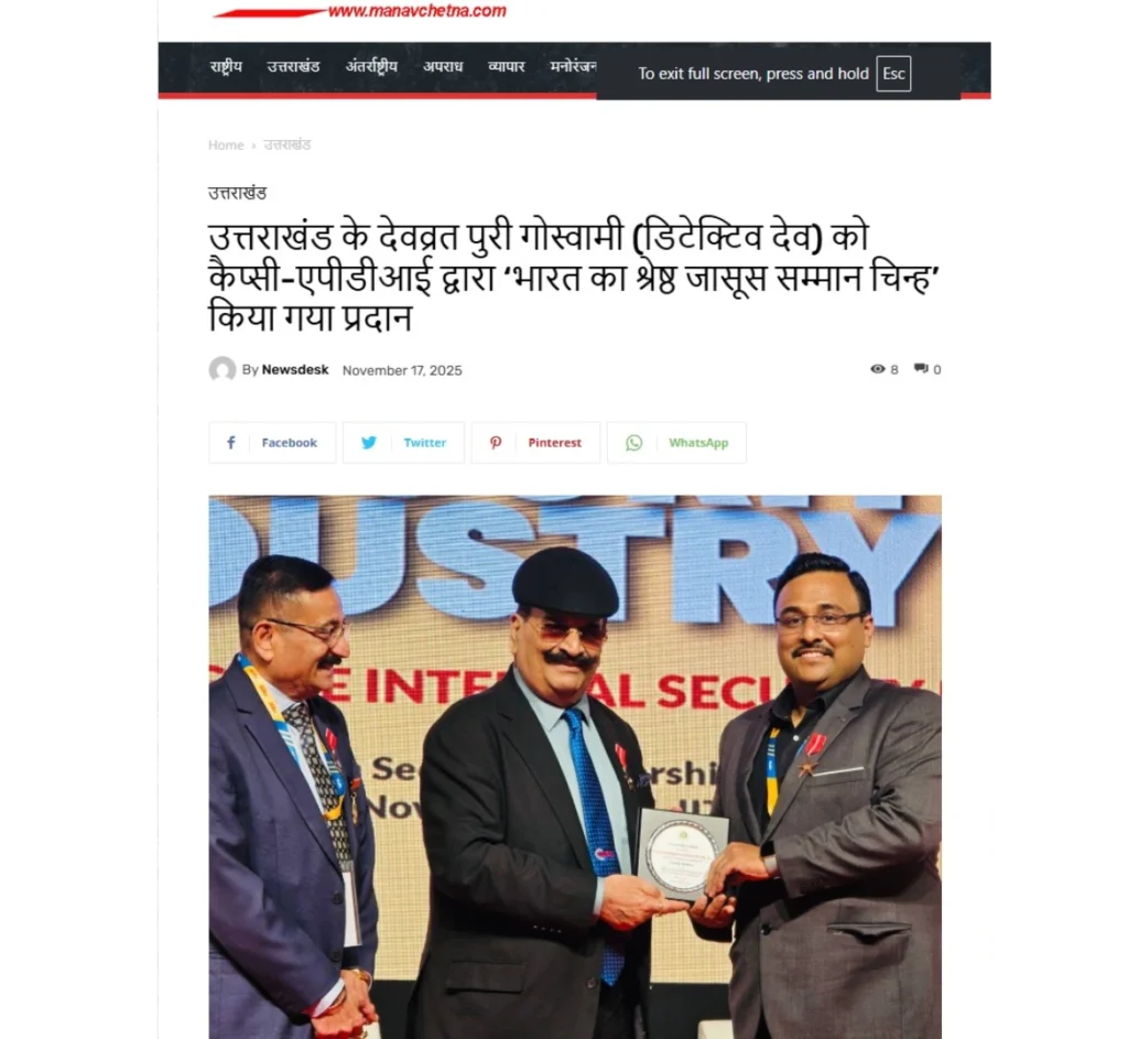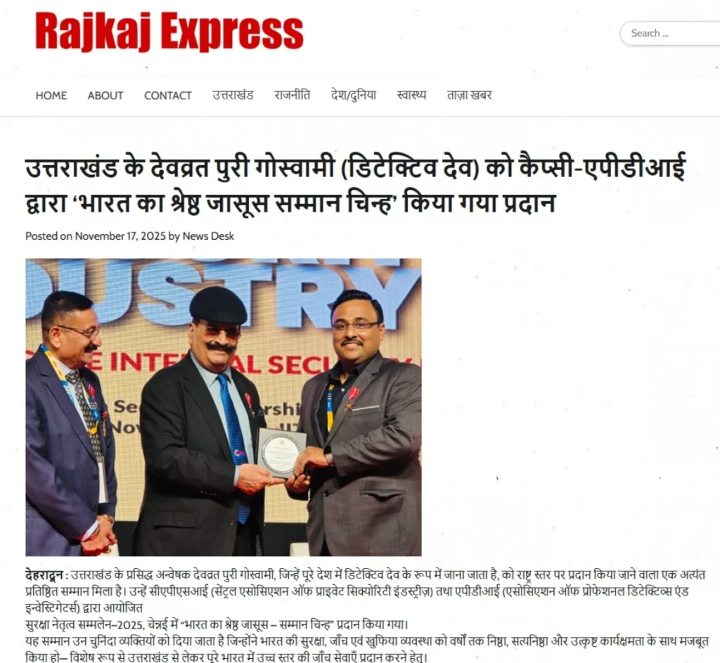 देवव्रत पुरी गोस्वामी (डिटेक्टिव देव) को देवभूमि राष्ट्रीय रत्न पुरस्कार 2025 से नवाज़ा गया। उन्हें यह राष्ट्रीय गौरव “जासूसी खुफिया उत्कृष्टता” (Detective Intelligence Excellence) श्रेणी में प्रदान किया गया, उनके अदृश्य लेकिन निर्णायक योगदान, राष्ट्रसेवा में अभूतपूर्व समर्पण और खुफिया अभियानों में अद्वितीय नेतृत्व के लिए कार्यक्रम के मुख्य अतिथि रहे सुबोध उनियाल, माननीय वन एवं उच्च शिक्षा मंत्री, उत्तराखंड सरकार द्वारा सम्मानित किया गया।